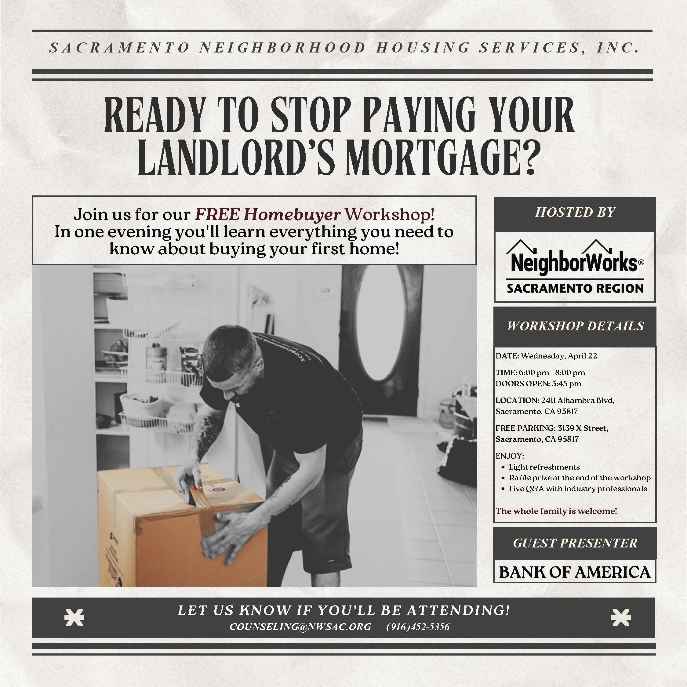 Ready to Stop Paying Your Landlord’s Mortgage? Free Homebuyer Workshop Join Sacramento Neighborhood Housing Services, Inc. and NeighborWorks Sacramento Region for a FREE Homebuyer Workshop designed to help first-time buyers […]